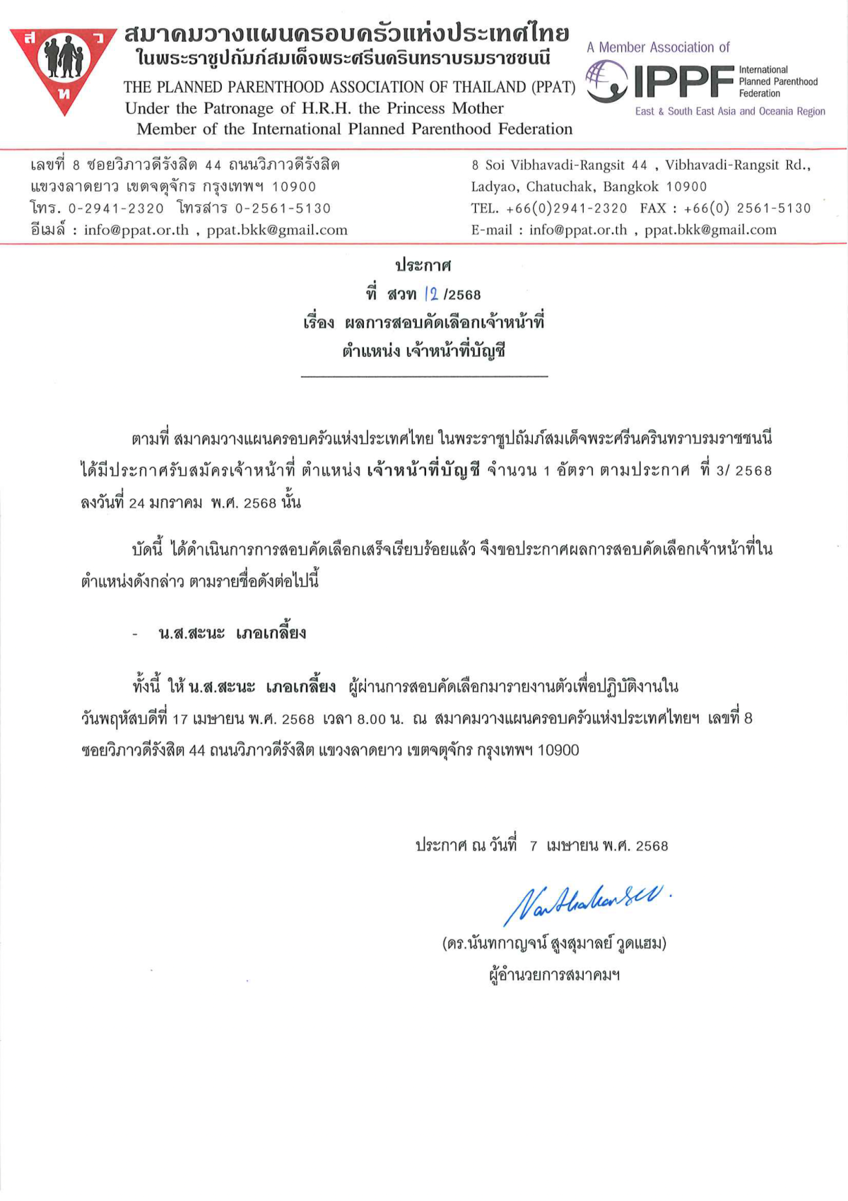 ประกาศผลการสอบคัดเลือกเจ้าหน้าที่บัญชี