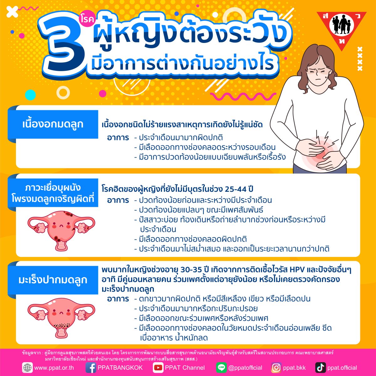 อาการ มะเร็งปากมดลูก :พบมากในหญิงช่วงอายุ 30-35 ปี เกิดจากการติดเชื้อไวรัส HPV และปัจจัยอื่นๆ อาทิ มีคู่นอนหลายคน ร่วมเพศตั้งแต่อายุยังน้อย หรือไม่เคยตรวจคัดกรองมะเร็งปากมดลูก